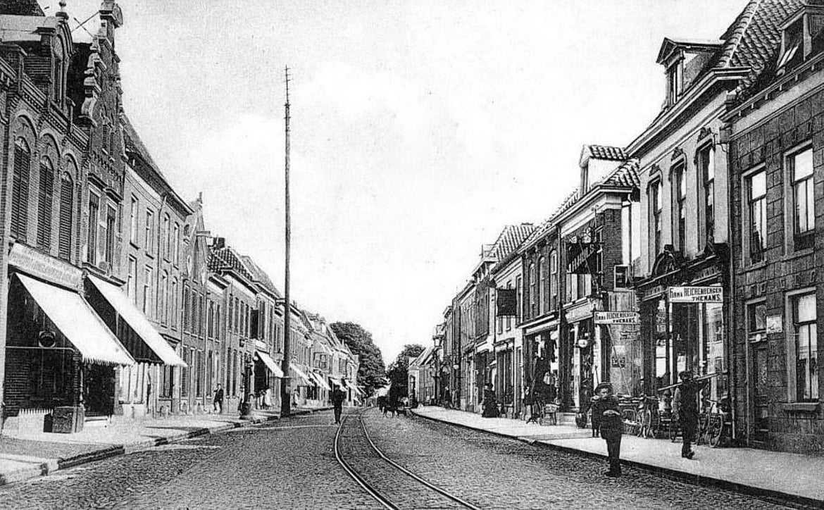 Hamburgerstraat vanaf de kerk gezien, geheel rechts het pand dat J. H. Huls (de vader van Tata Huls) in 1911 liet bouwen, (enkele jaren later dan foto boven rechts). De grote glazen pui was in die periode heel uitzonderlijk.