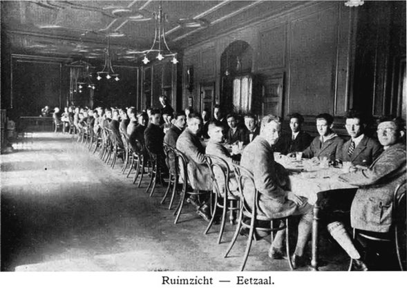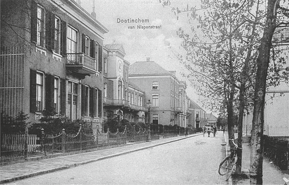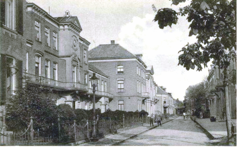 1920: Het gemeentelijk gymnasium in de van Nispenstraat. (Middelste pand rechts) werd in 1879 in gebruik genomen. Na 1945 verhuisde het naar Ruimzicht en trok de R.K. HBS (St. Ludger College) in het oude gymnasiumpand, tot zij verhuisden naar de Vondelstraat. Rechts op de voorgrond het internaat 'Schakel' voor de jongens van de Groen van Prinsterer-kweekschool. Aan de overzijde van de straat lag het gymnasium de Lukasstichting. In het pand achter in het midden op de foto woonde o.a. de heer Bruyel die een zaak had in de Hamburgerstraat en later op huize 'Slingevliet' ging wonen.