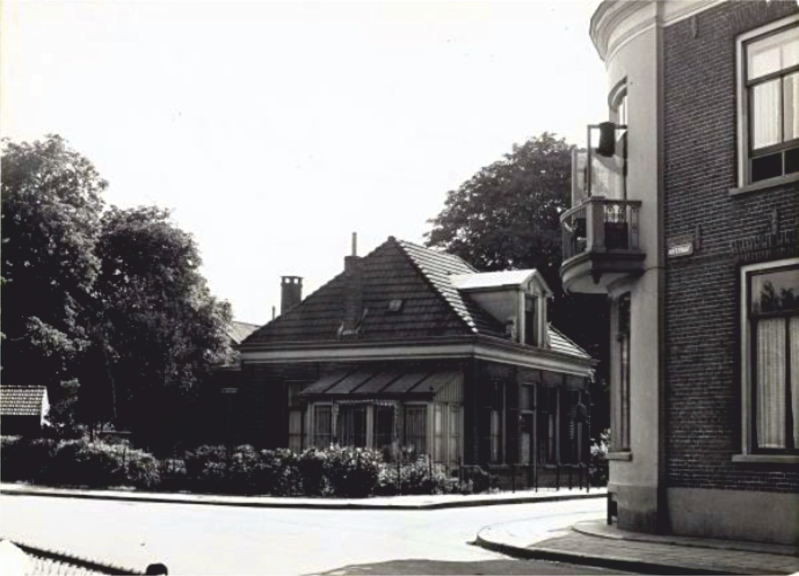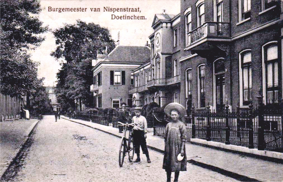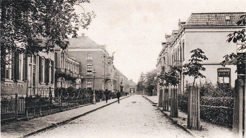 1915: De van Nispenstraat vanuit de Plantsoenstraat gezien. Rechts op de voorgrond werd ca. 1920 het postkantoor gebouwd. Links een dubbel herenhuis bewoond daar de heer P. J. Landry (Wethouder.) Het pand heeft lange tijd dienst gedaan als kantoor van de Nationale Bank.