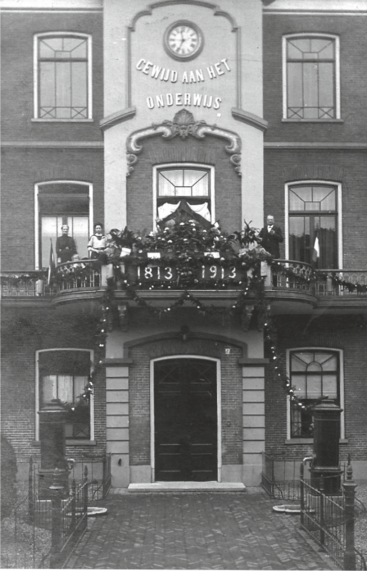 Versierde hoofdingang van het gymnasium/lyceum. Nationale tentoonstelling Vrouwenbeweging 1813-1913