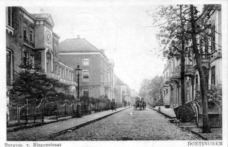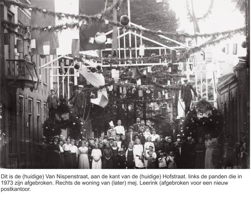 De Burgemeester van Nispenstraat gezien vanuit de Hofstraat omstreeks 1895. Links de woning, die het laats door mej. Leerink werd bewoond. Zie een der stadspompen links. De panden rechts op de voorgrond zijn gedeeltelijk nog intact.