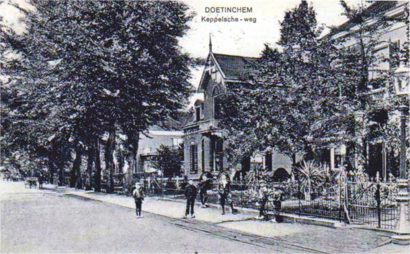8: Keppelseweg gezien vanuit de IJsselstraat. Rechtdoor ga je de Loolaan in.De villa links ligt aan de Keppelseweg 42. Deze staat er nog steeds hoewel die door veel groen grotendeels aan het zicht is onttrokken.