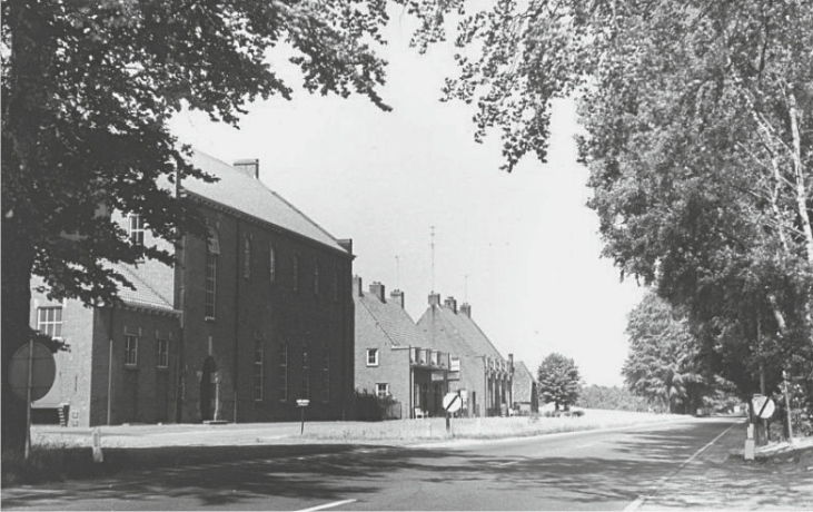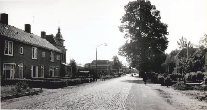 14: Keppelseweg vanuit de Grutstraat gezien. Links het pand van bakkerij Bloemers. Het huis rechts werd omstreeks 1937 afgebroken en maakte plaats voor een tankstation. Ernaast het gebouw van Christelijke Belangen en de villa van mevrouw Horsting.