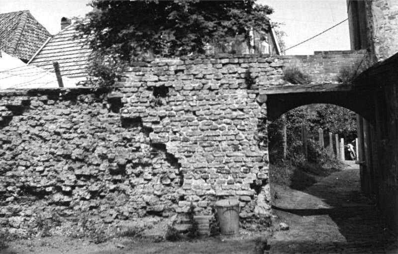 Foto uit 1927 van het poortje aan de Nieuwstad in de oude stadsmuur die in de twaalfde eeuw gebouwd werd rondom de stad. Na de oorlog afgebroken.